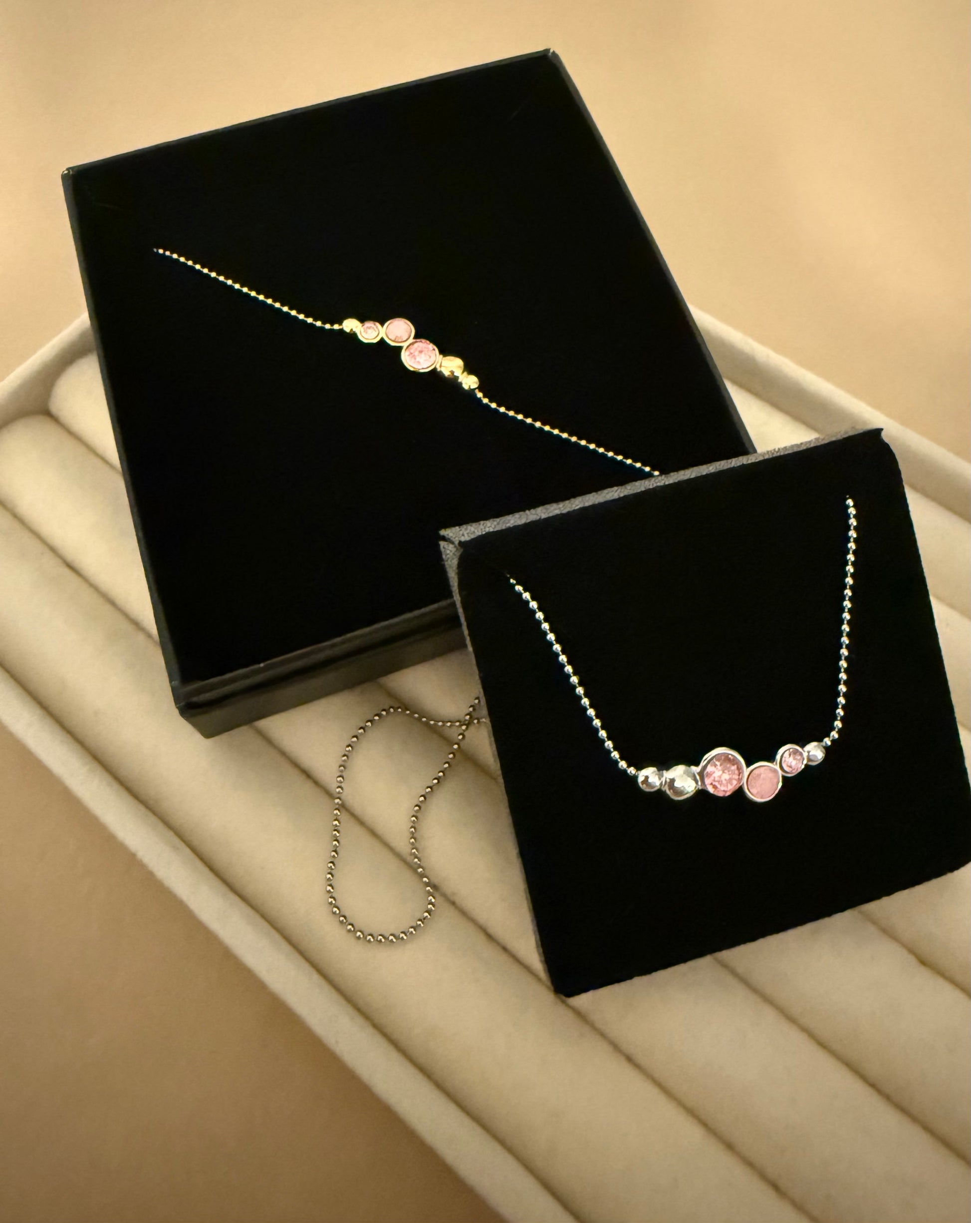 Vi pakker dine smykker ind i vores fine smykkeæsker (som er gratis) og med silkepapir.