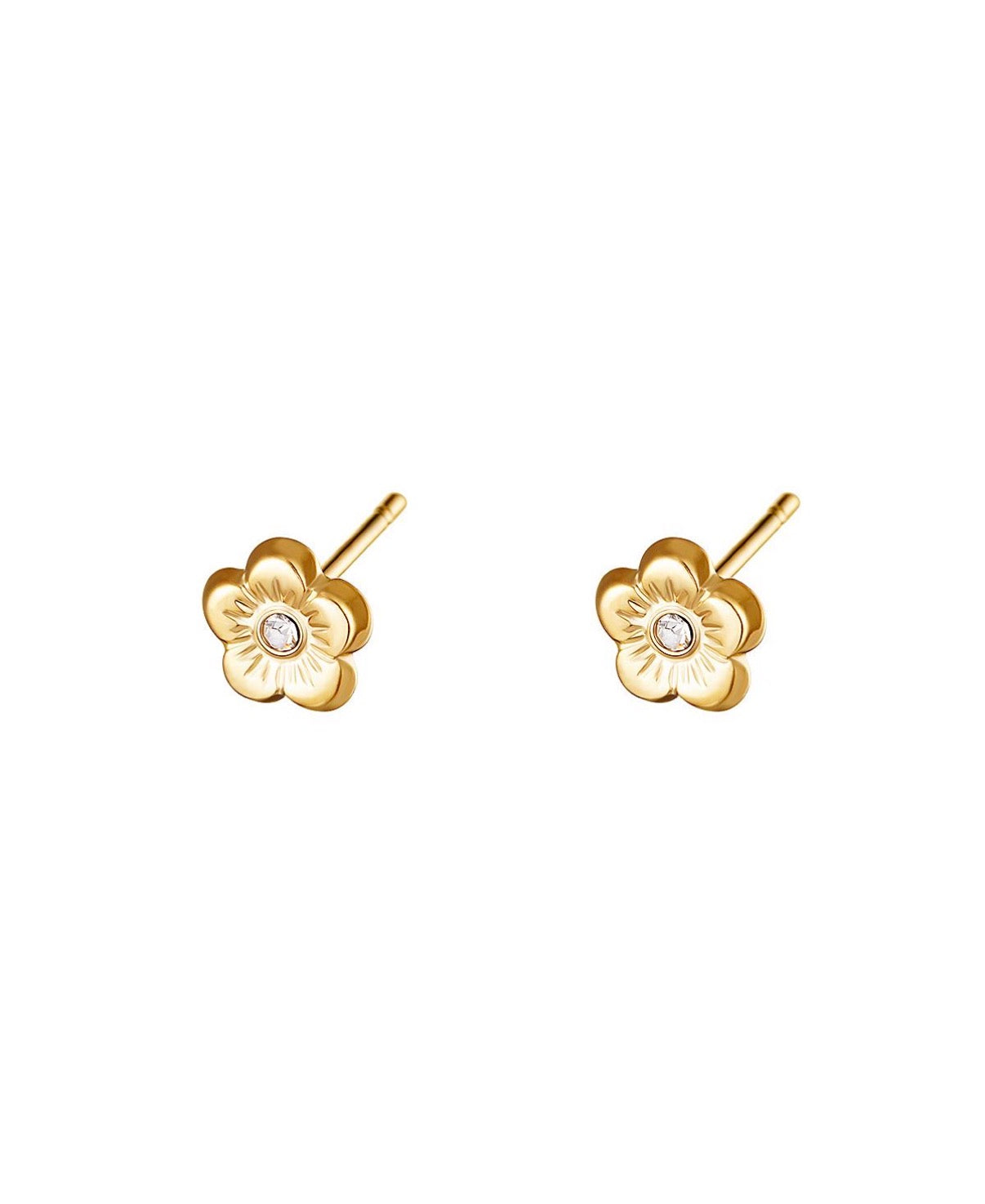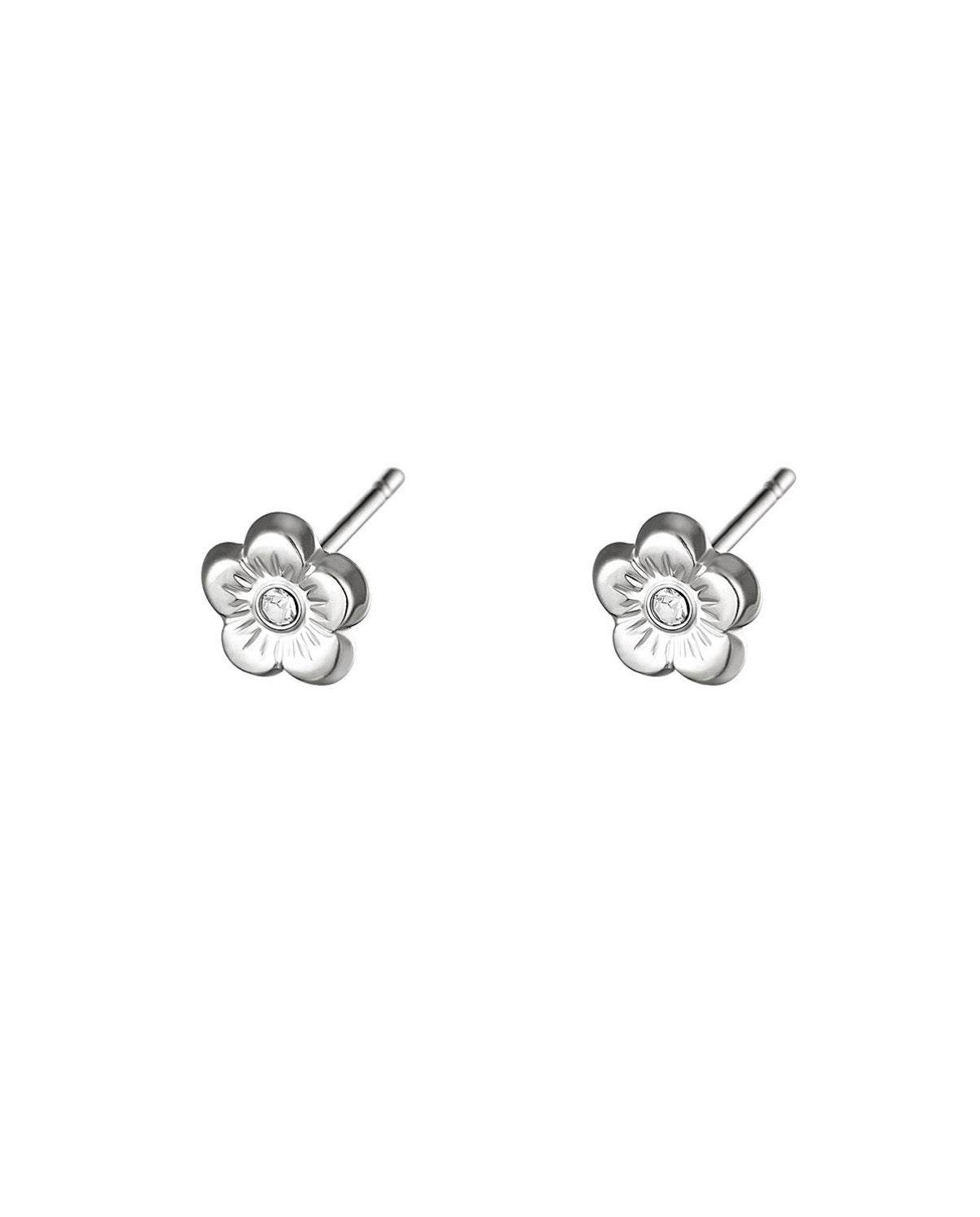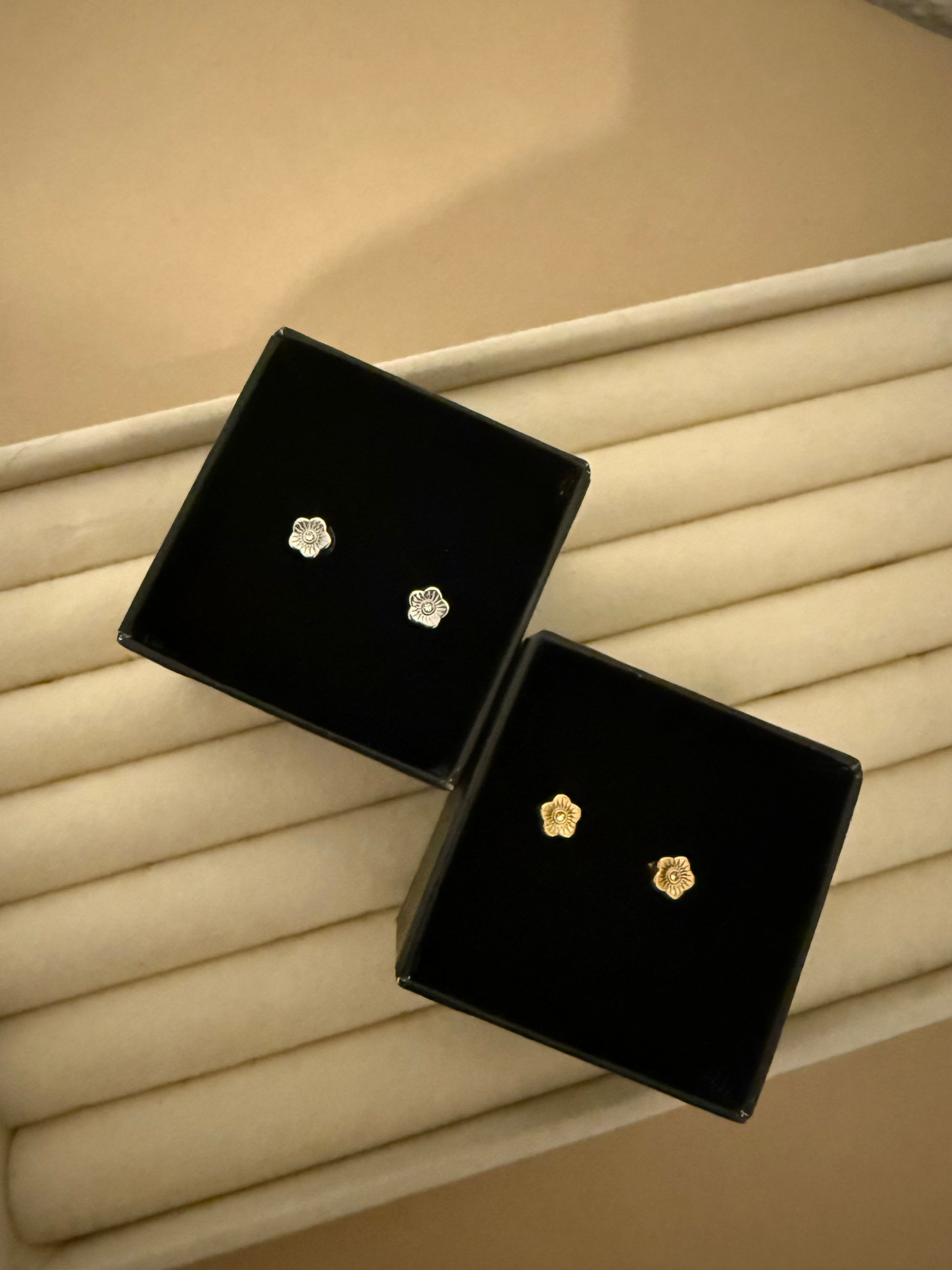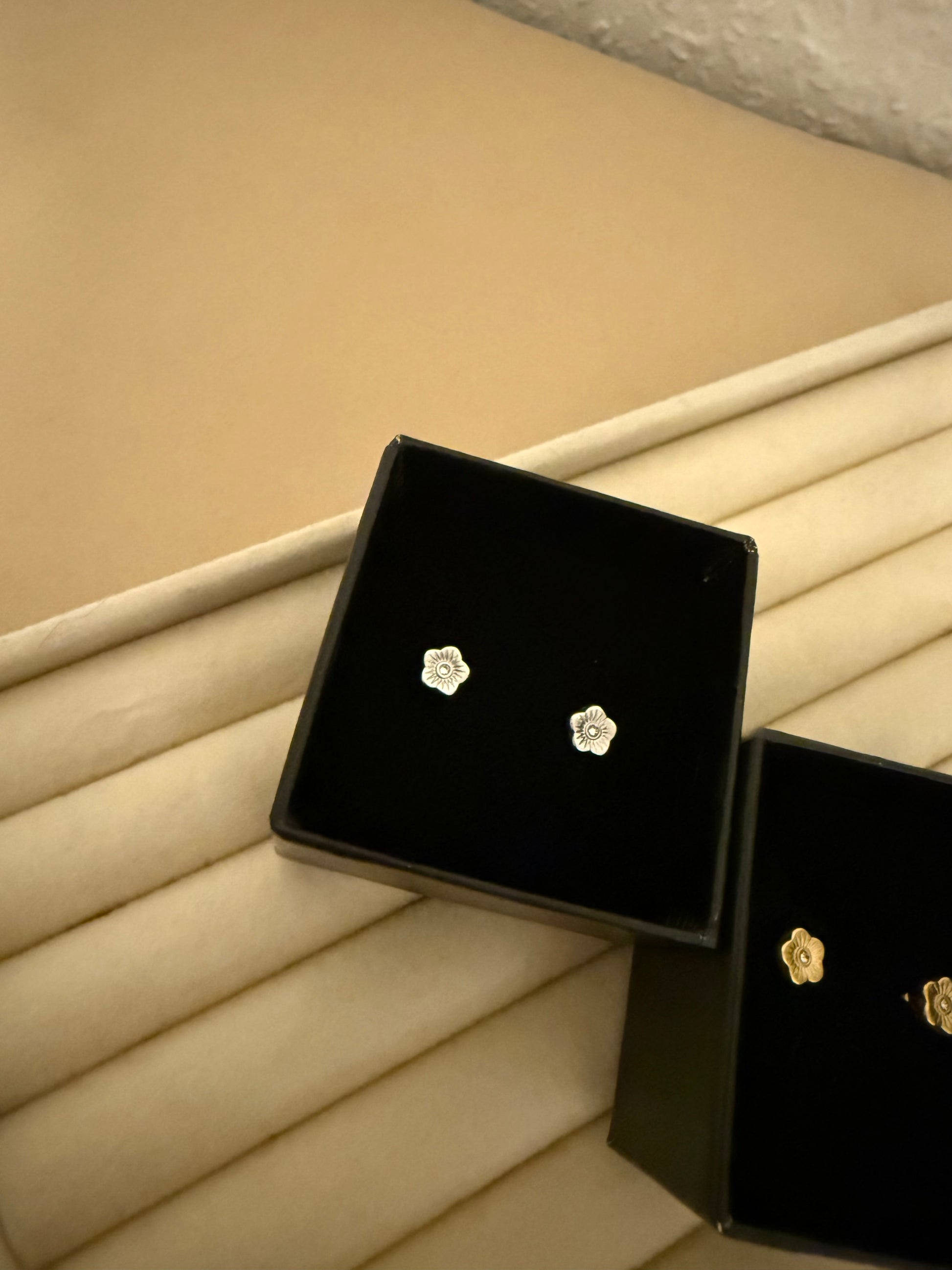 De fineste Mini Flower Ørestikkere formet som en lille blomst med en sten i midten.