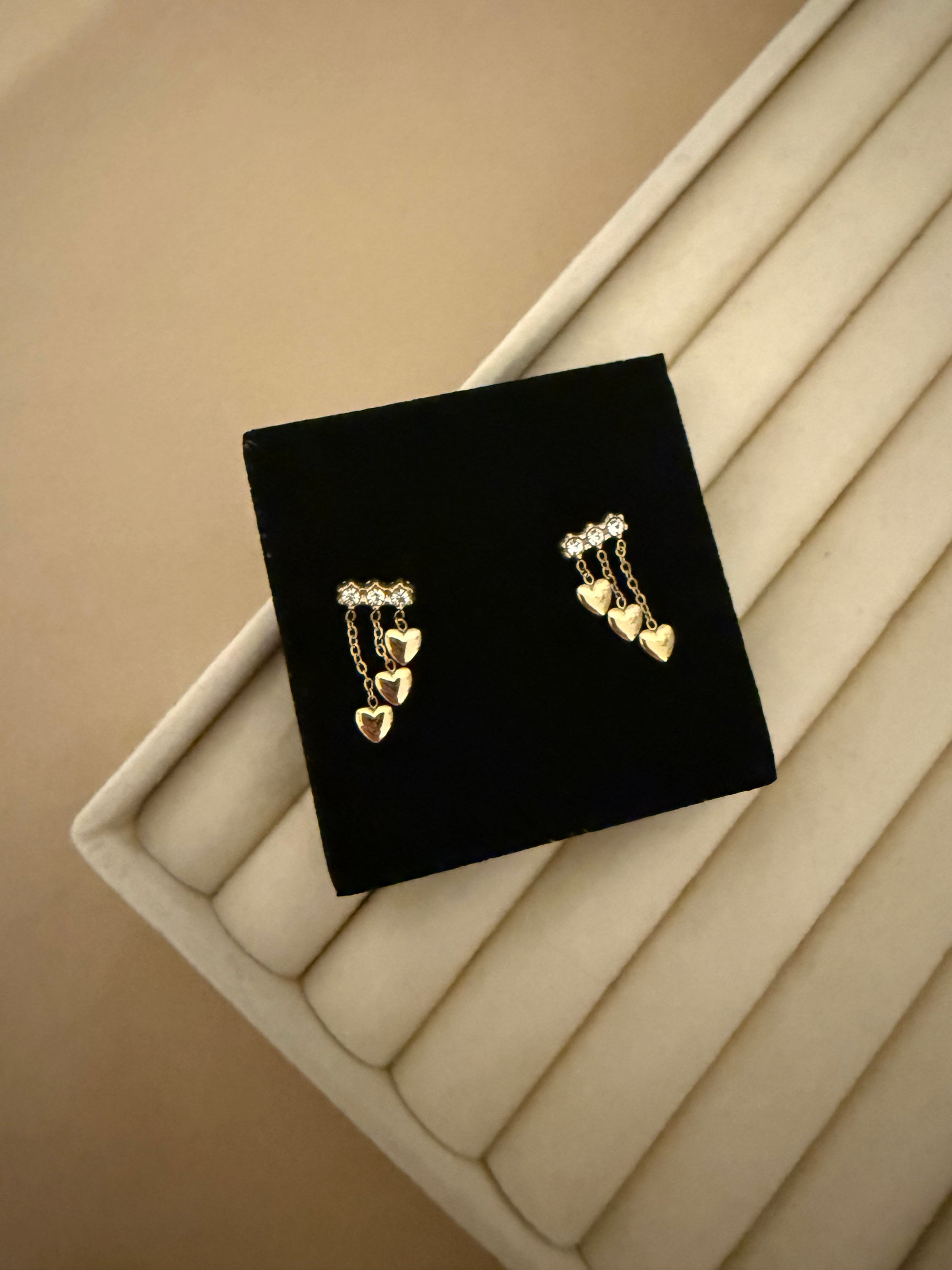 De fineste små Triple Love Øreringe med 3 små hængende kæder i hver med hjerte forneden.