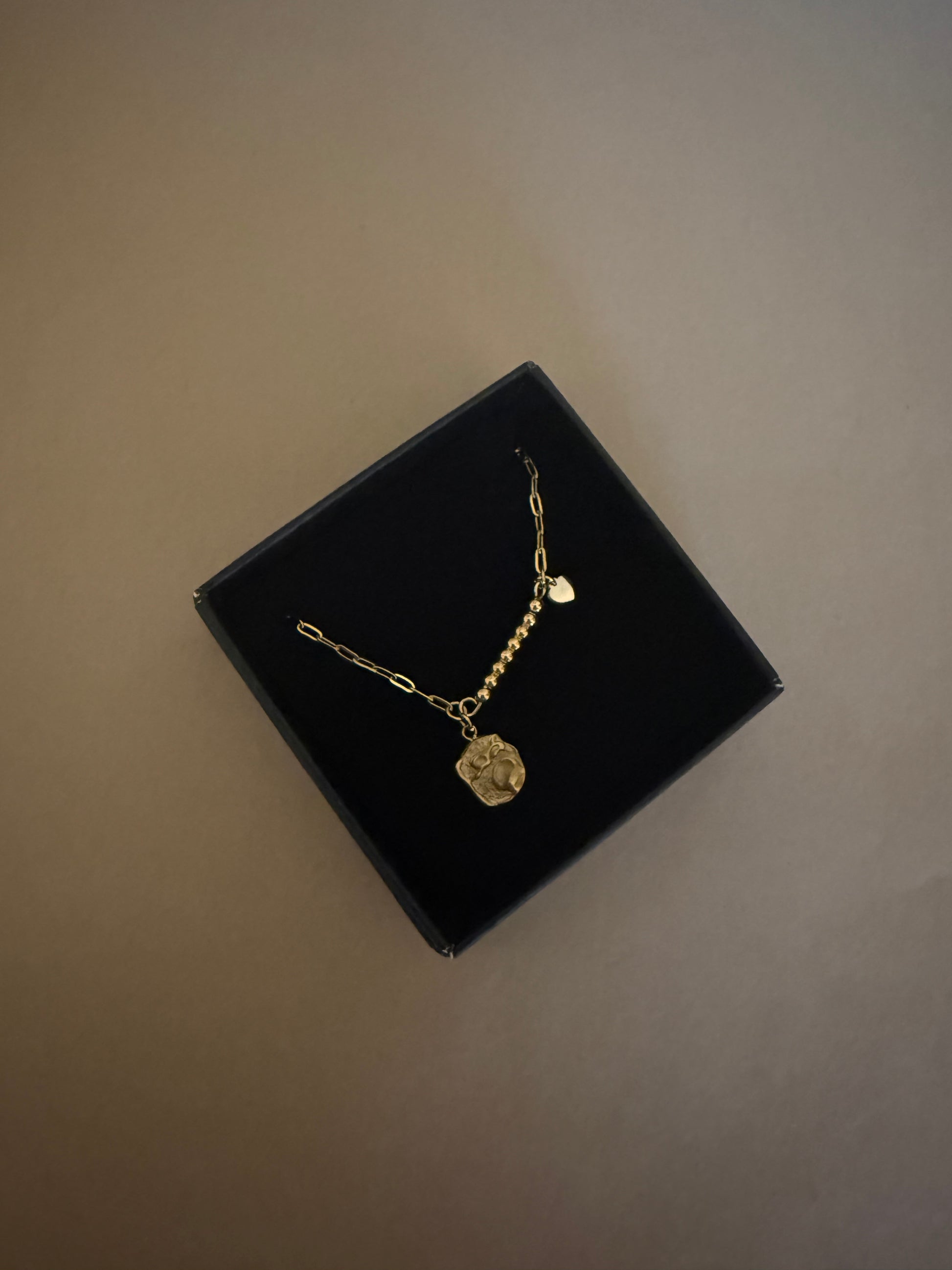 Det fineste Yrsa armbånd med vedhæng med organisk overflade samt et lille fint hjerte og små detaljer, i forgyldt rustfrit stål.